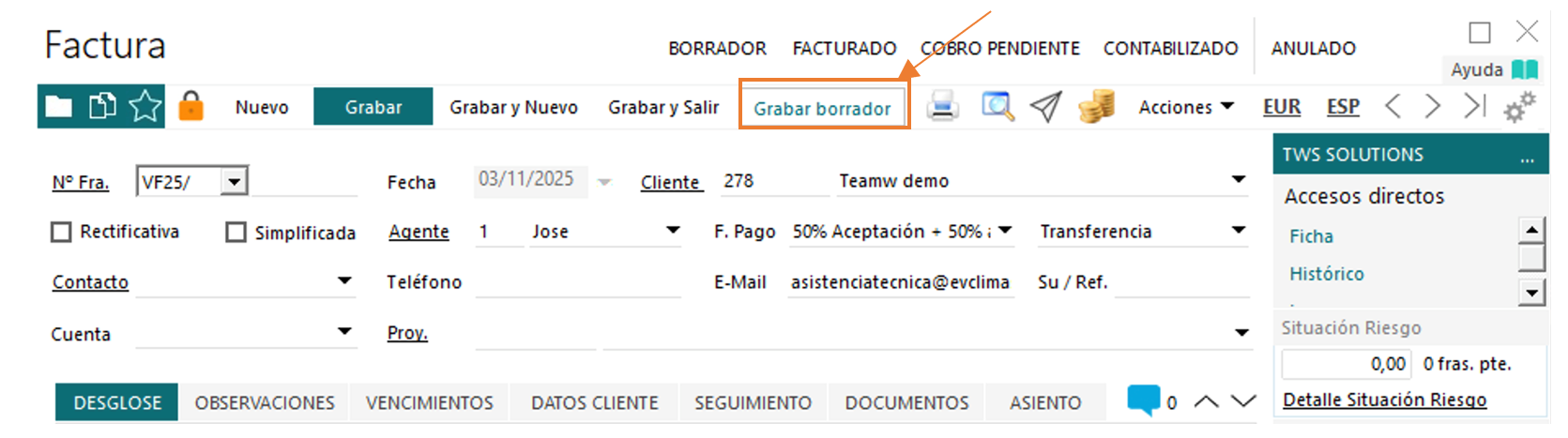 Para grabar una factura en estado Borrador, bastará con seleccionar la opción “Grabar borrador” en la parte superior, en vez de la opción habitual de “Grabar” (la cual genera la factura definitiva, sin pasar por borrador):