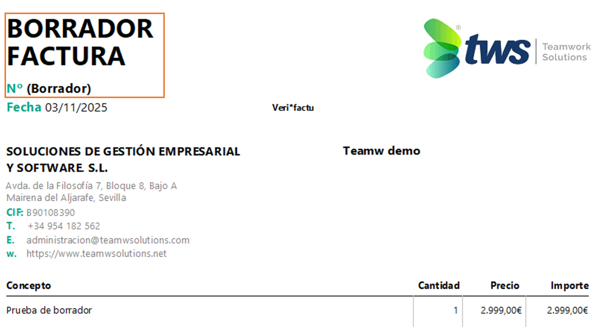 Al visualizar una factura BORRADOR, saldrá de la siguiente manera: