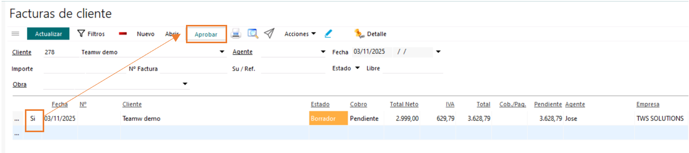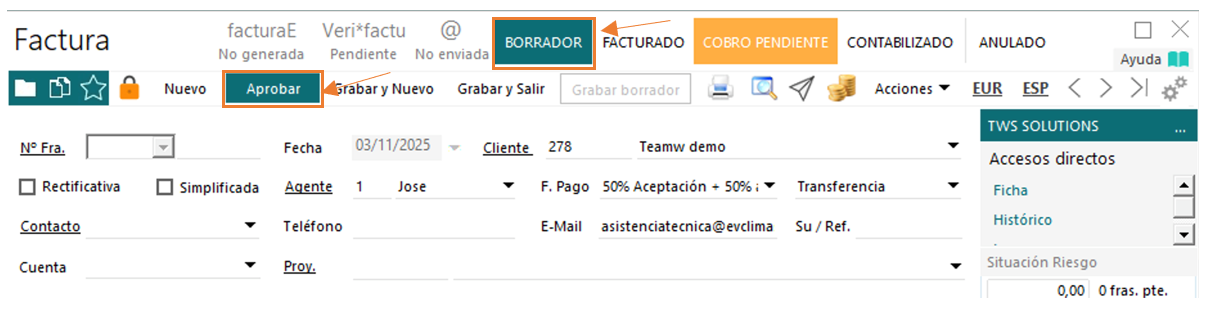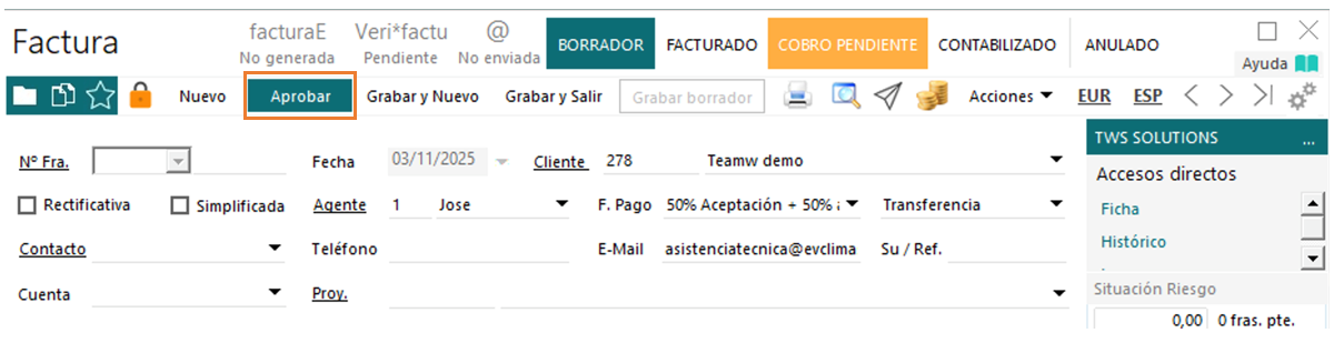Si la marcamos como Aprobada, automáticamente se registrarán facturas definitivas.