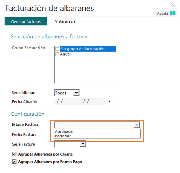 Para generar las facturas en estado Borrador desde la facturación automática de albaranes, deberemos marcar la opción de “Estado Factura” en “Borrador”.