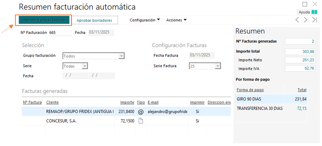 A tener en cuenta: mientras las facturas no estén aprobadas, desde la Facturación masiva de albaranes no se podrá ni imprimir ni enviar las facturas al cliente. Una vez aprobadas, se habilitará la opción: