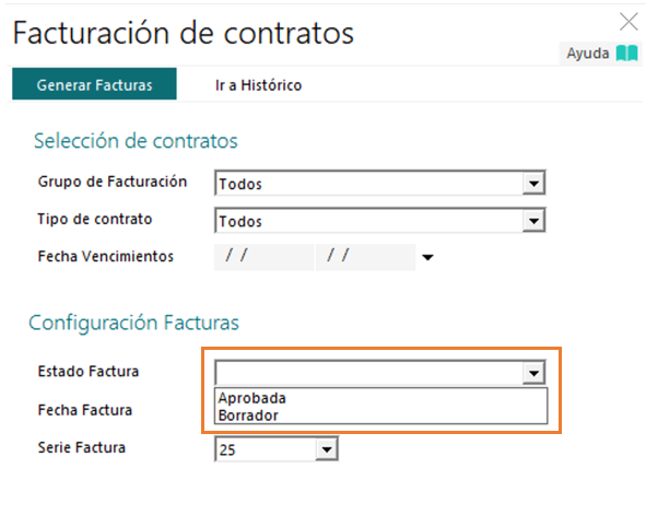 Para generar las facturas en estado Borrador desde la utilidad de Facturación de Contratos, marcaremos la opción “Estado Factura” en “Borrador”: