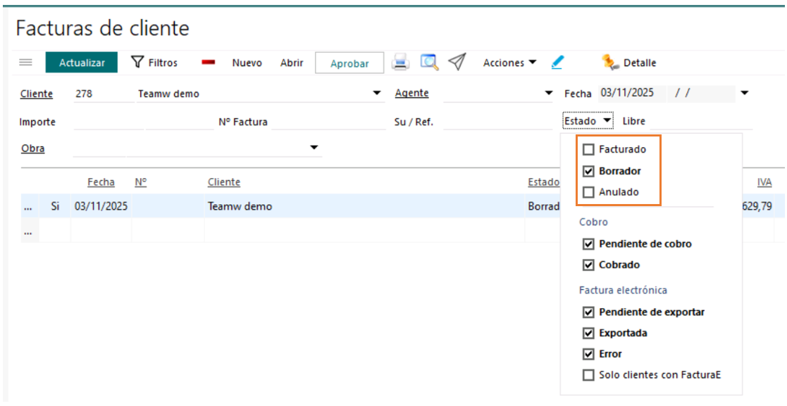 Para aprobar las facturas de manera masiva, deberemos seleccionar aquellas en estado Borrador que queremos Aprobar: