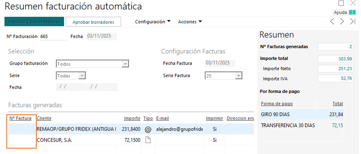 Si se han generado en estado Borrador, en el Resumen de Facturación de automática veremos los borradores generados sin nº de Factura: