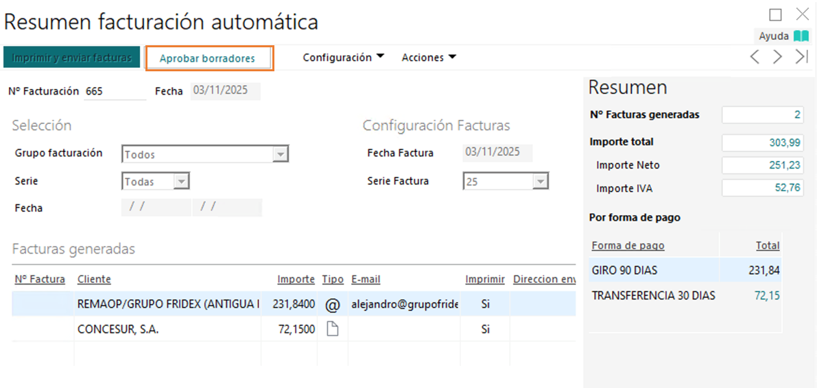 Desde esta misma pantalla, si vemos que el resumen está OK y queremos aprobarlas, podemos seleccionar la opción “Aprobar borradores”, situada en la parte superior de la ventana, y registrará las facturas de manera definitiva: