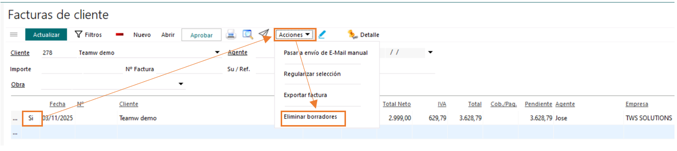 Desde el listado de Facturas, podremos tanto aprobar las facturas de manera masiva, como eliminar las facturas en estado borrador.