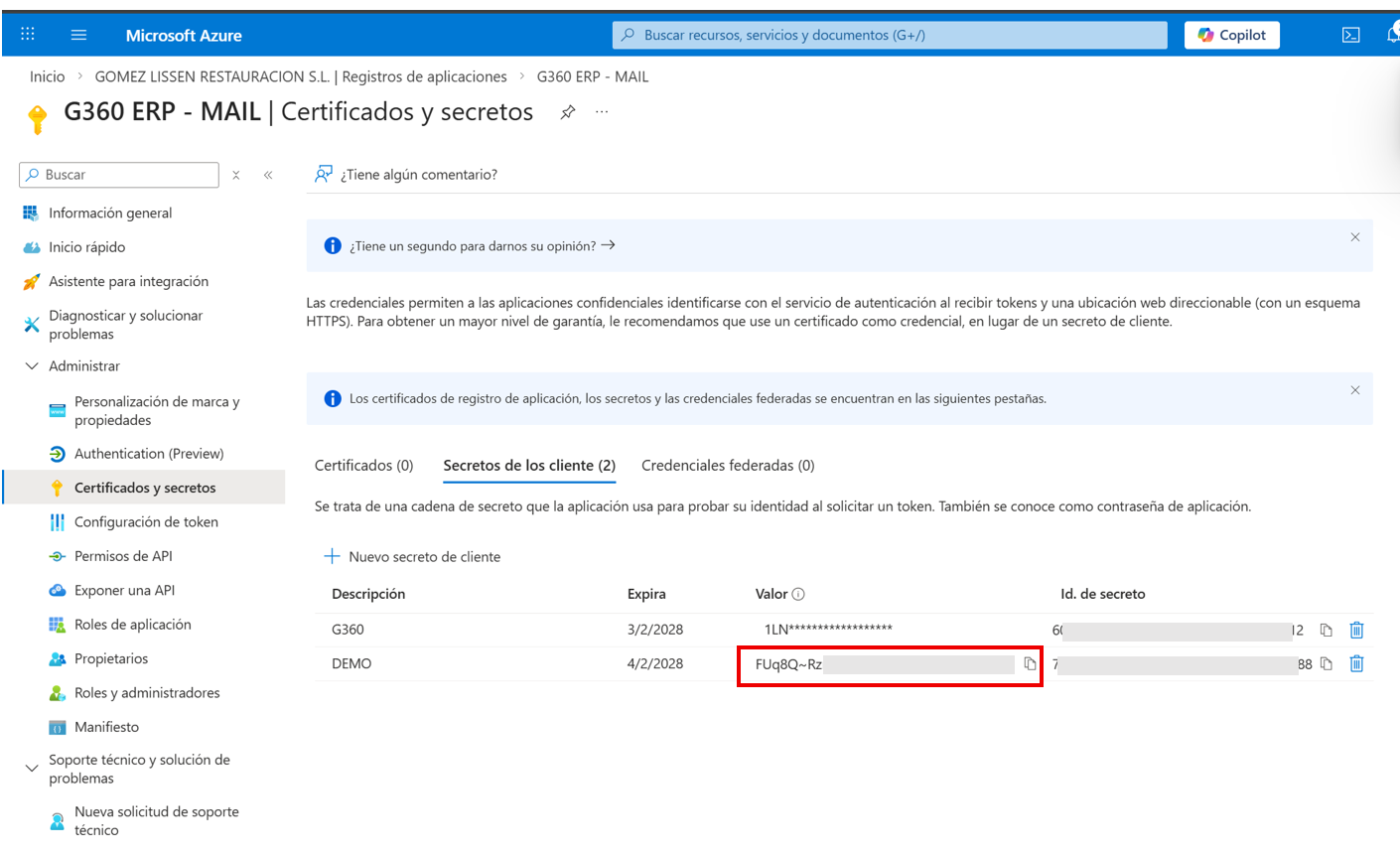 Con este último paso, ya tenemos los 3 datos que necesitamos configurar en G360 ERP (ID aplicación, ID Directorio y Valor secreto).