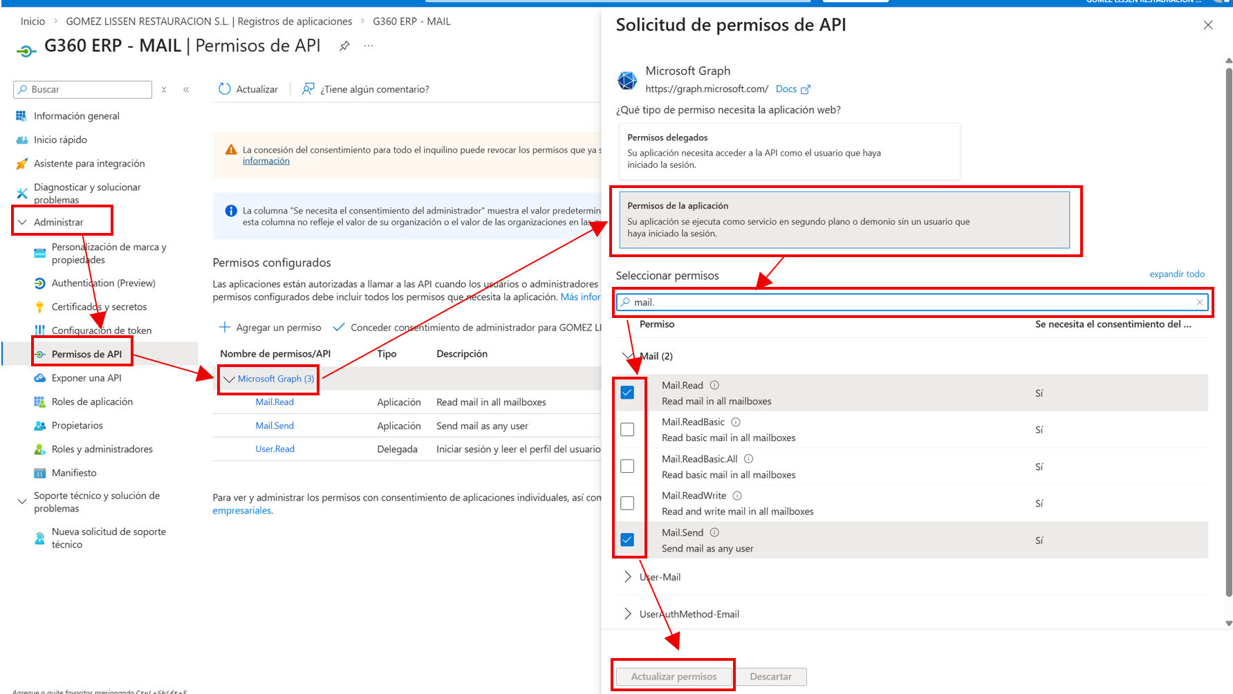 Paso 2: Asignar permisos para Leer y Enviar correos