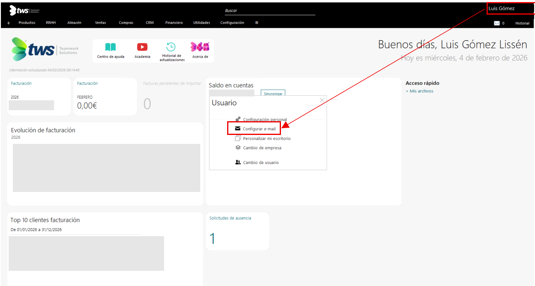 Ahora, acudiremos a la configuración de la cuenta de correo (en este caso, una cuenta del usuario). Pulsaremos sobre el usuario logueado, y abriremos la opción “Configurar mail”: