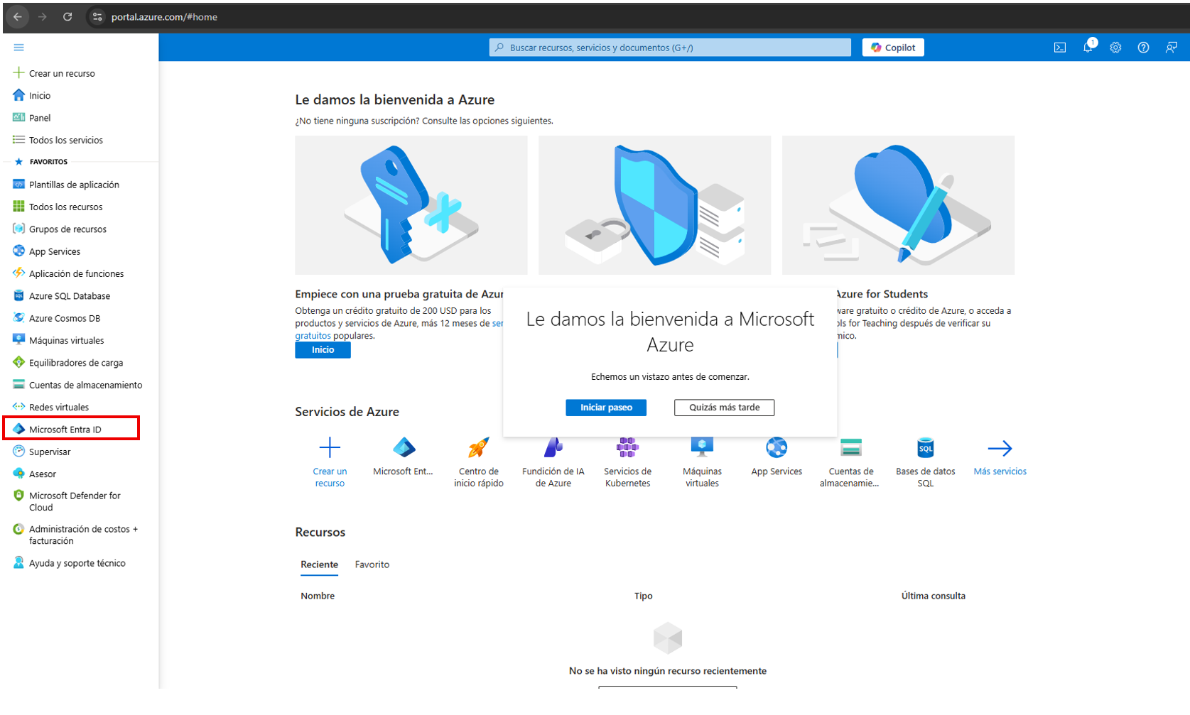 Para ello, accederemos al Portal de Azure (https://portal.azure.com/#home) y dentro del mismo, abrimos Microsoft Entra ID: