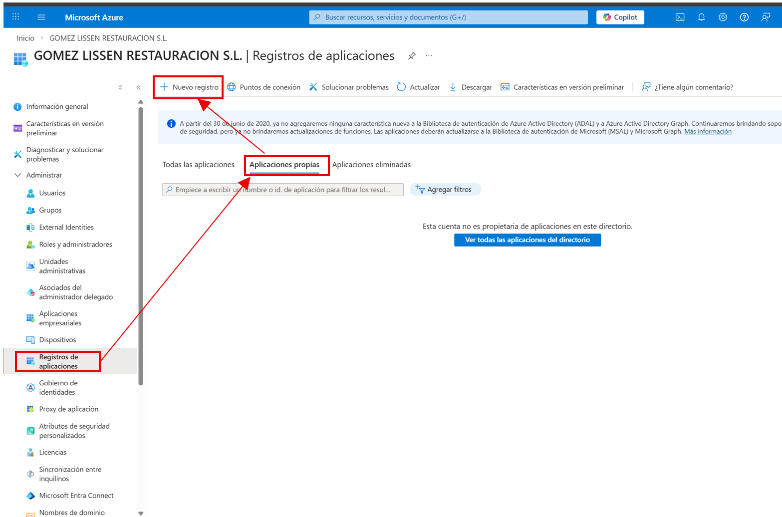 Una vez dentro de Microsoft Entra ID, acudiremos a “Registro de Aplicaciones”, seleccionaremos “Aplicaciones propias”, y le daremos a “+ Nuevo Registro”: