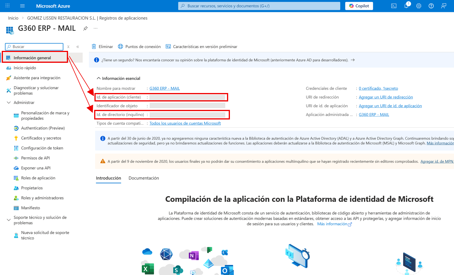 Ahora, en Información General de la aplicación, ya tendremos dos de los primeros datos que necesitamos (“ID de aplicación” e “ID de directorio”):