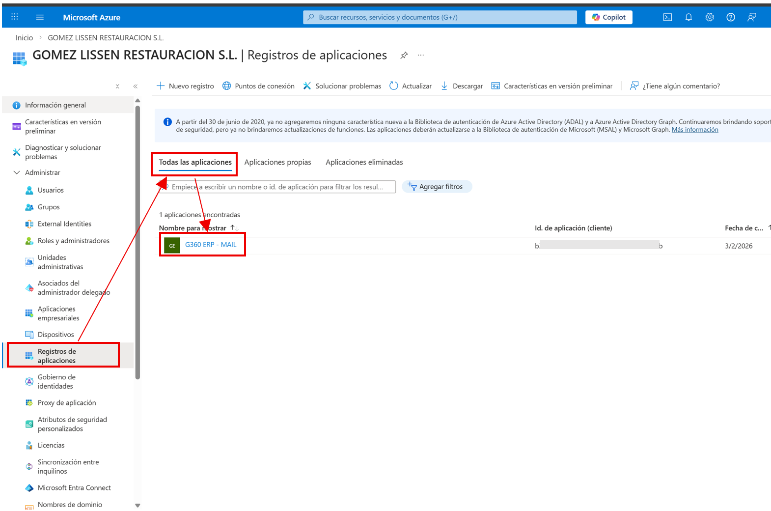 Volveremos a entrar en Microsoft Entra ID, iremos a “Registro de Aplicaciones”, pulsaremos sobre “Todas las aplicaciones” y abriremos la aplicación que hemos dado de alta (en este ejemplo, G360 ERP – MAIL):