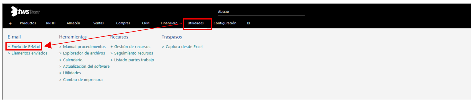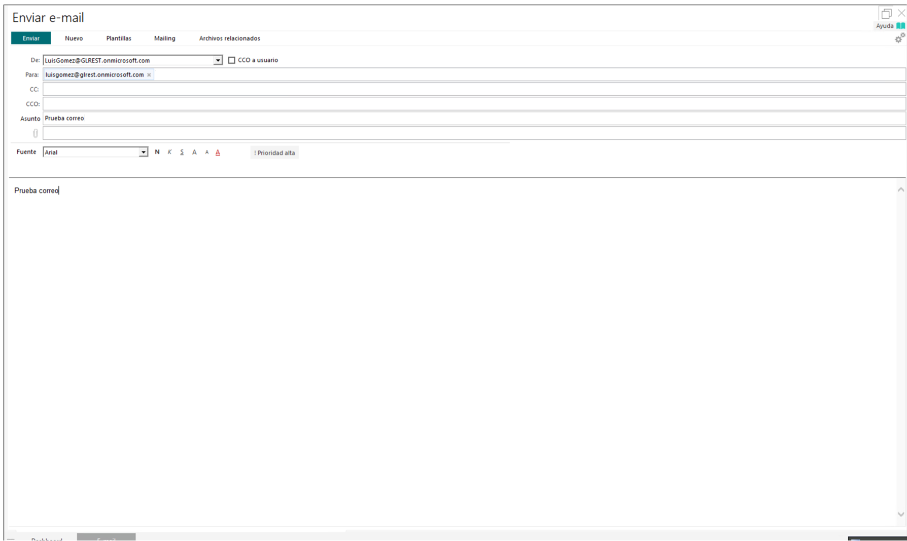 Por último y para comprobar que todo funciona correctamente, enviaremos un mail de prueba. Para ello, acudiremos a Utilidades > Envío de mail, introduciremos destinatario, asunto y cuerpo, y pulsaremos enviar: