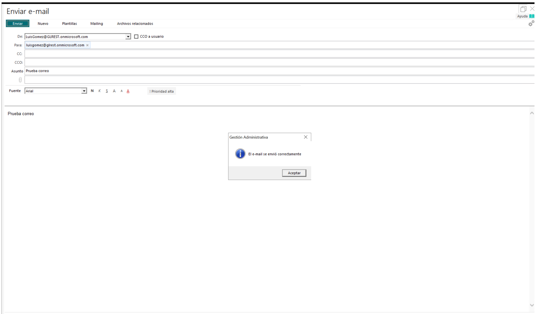 Si al enviar, sale el mensaje “El e-mail se envió correctamente”, quiere decir que tanto la configuración de la aplicación en Azure como los datos introducidos en G360 ERP, están correctos: